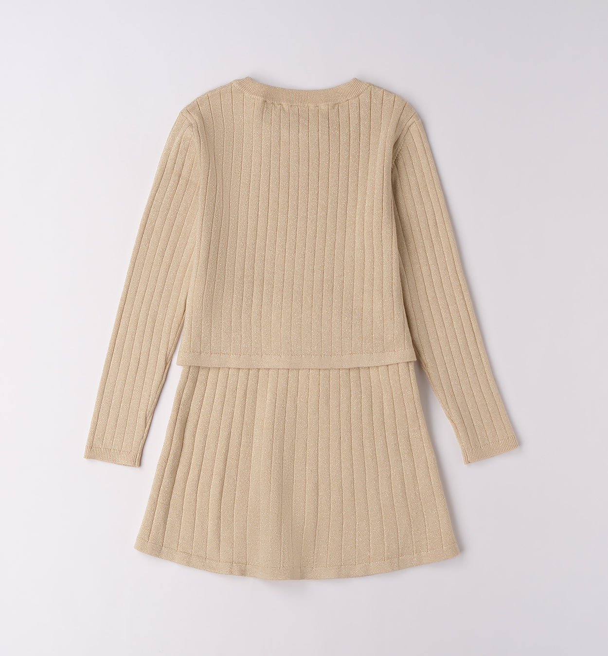 completo maglia ragazza beige con catena dorata – vestito in maglia a coste con leggero effetto luminoso, maniche lunghe e scollo rotondo impreziosito da dettaglio catena gold. modello con corpetto aderente e andando leggermente svasata per una vestibilità comoda e femminile. perfetto per occasioni speciali o per look eleganti da tutti i giorni, da abbinare a stivaletti o ballerine per un outfit raffinato e alla moda.