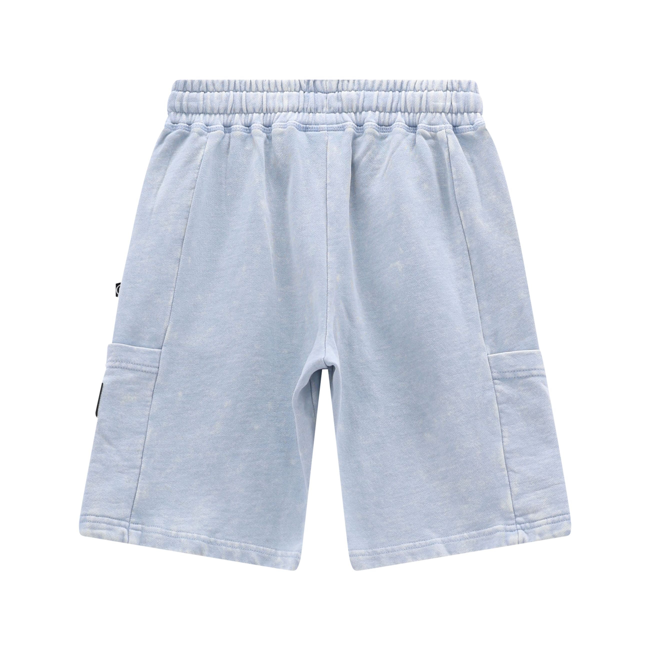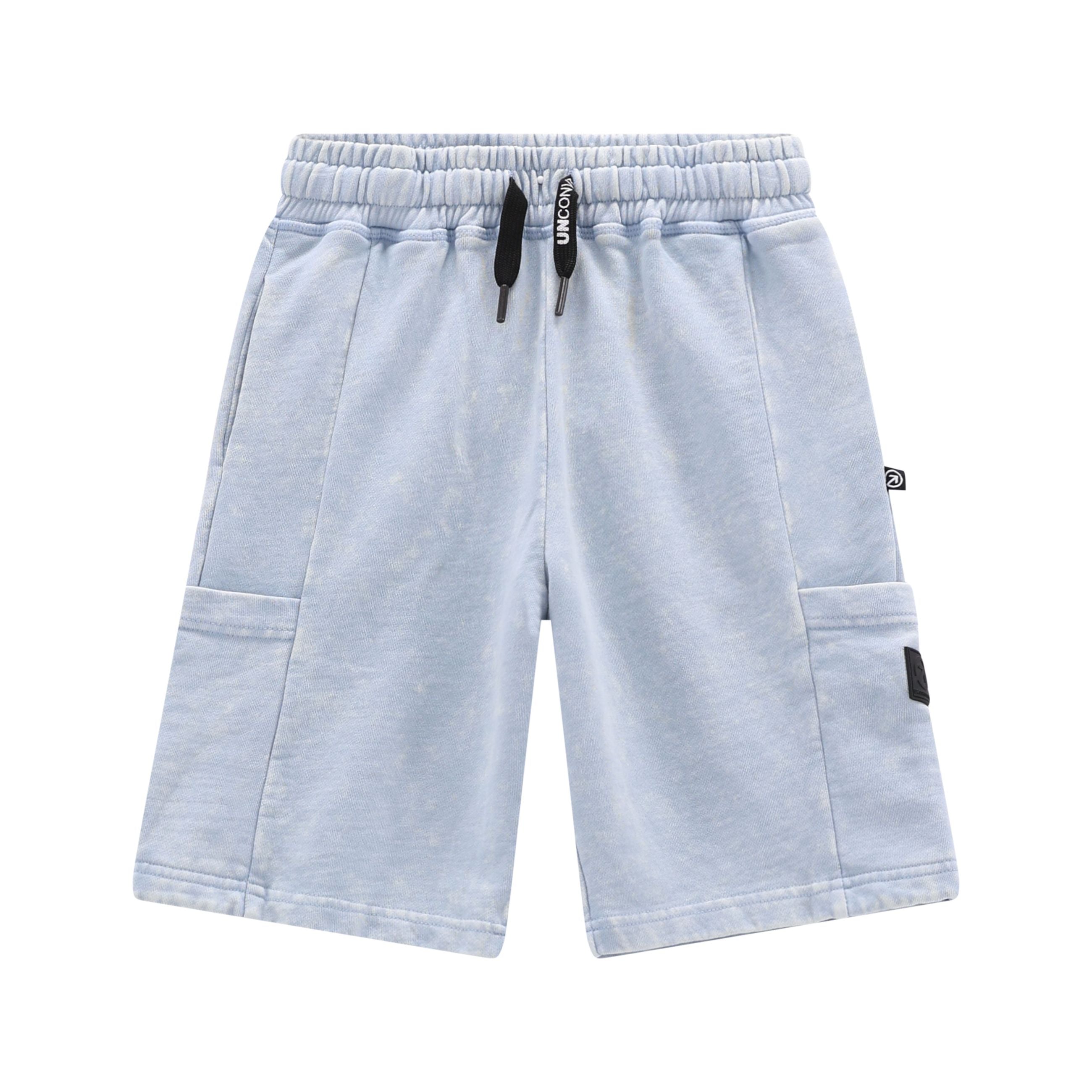 bermuda jogger ragazzo azzurro effetto lavato con coulisse – pantaloncini in morbido cotone dallo stile urban e moderno, caratterizzati da un particolare effetto lavato che rende ogni capo unico. il modello presenta elastico in vita con coulisse regolabile per una vestibilità comoda e personalizzabile, tasche laterali e dettagli logo applicati che aggiungono un tocco street discreto. linea dritta e lunghezza al ginocchio li rendono pratici e versatili. ideali da abbinare a t-shirt, canotte o felpe leggere per outfit casual e dinamici, perfetti per scuola, tempo libero e giornate estive.