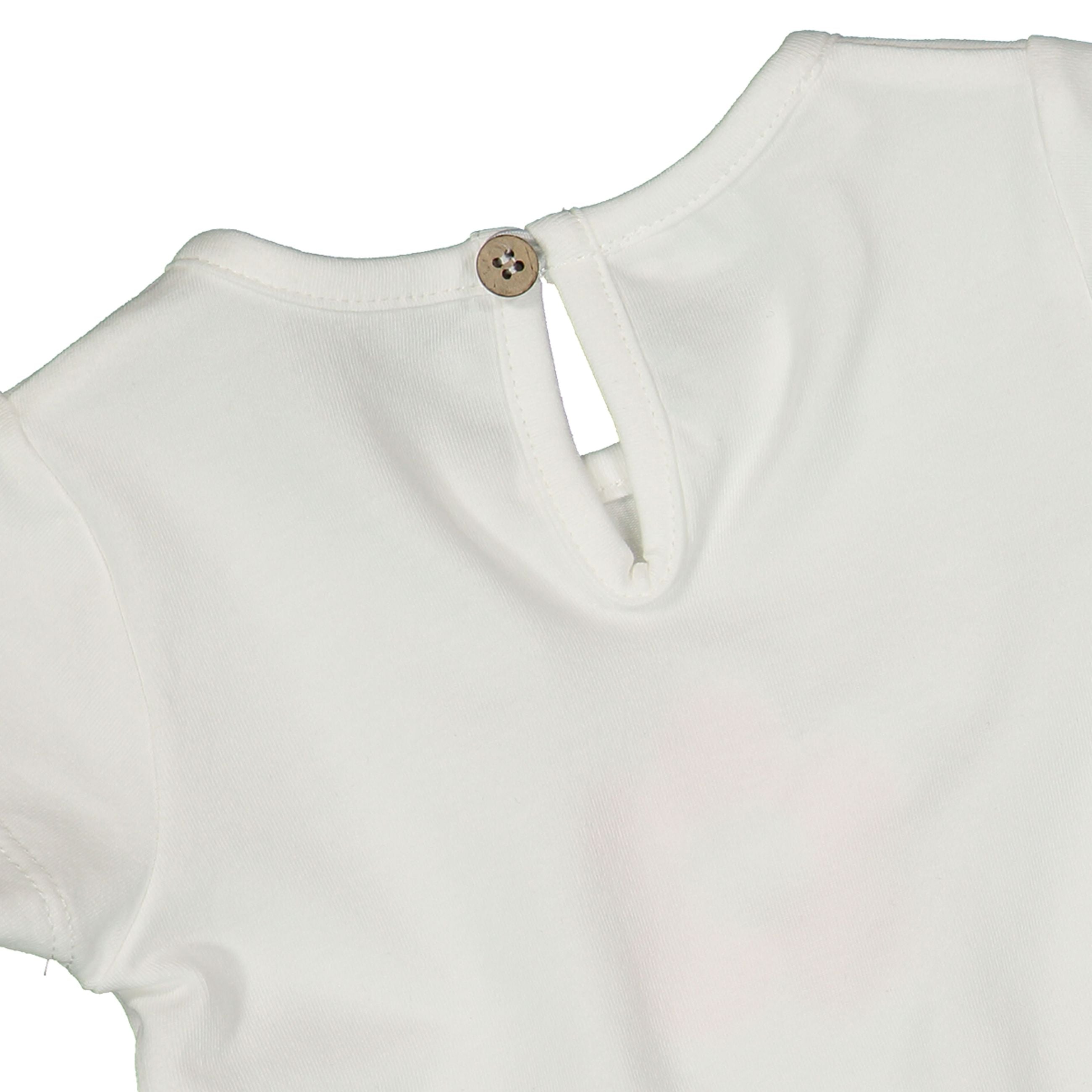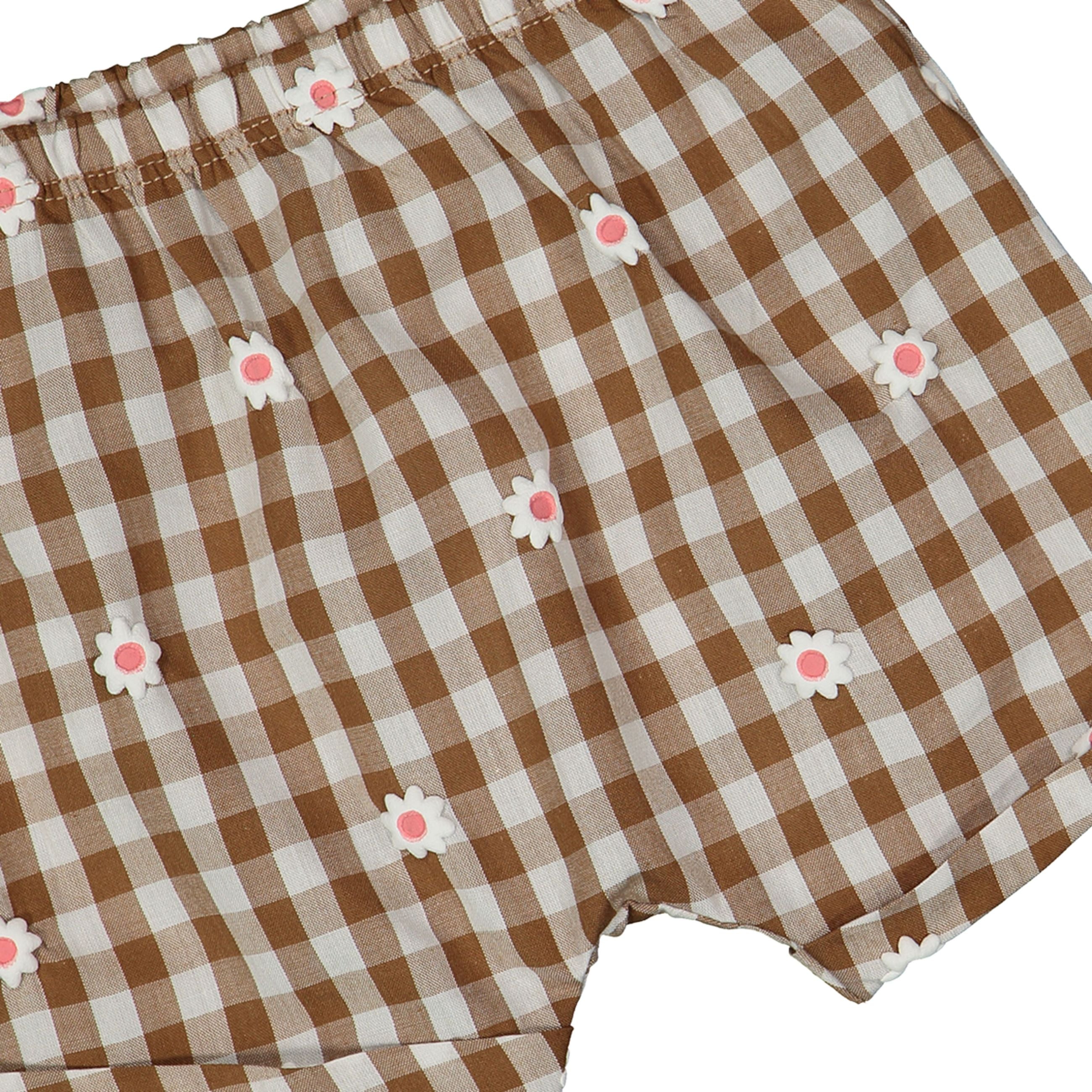 completo bambina 2 pezzi panna e marrone con fiore – set coordinato in morbido cotone composto da t-shirt e shorts, perfetto per look estivi freschi e delicati. maglietta panna con apertura posteriore a bottoncino e stampa frontale “hello cutie!” arricchita da fiore applicato effetto rilievo con dettagli glitterati, per un tocco dolce e luminoso. shorts in tessuto leggero fantasia vichy marrone con micro fiorellini applicati e vita elasticizzata per il massimo comfort. ideale per outfit pratici ma curati, perfetto da indossare nelle giornate più calde con uno stile tenero e raffinato