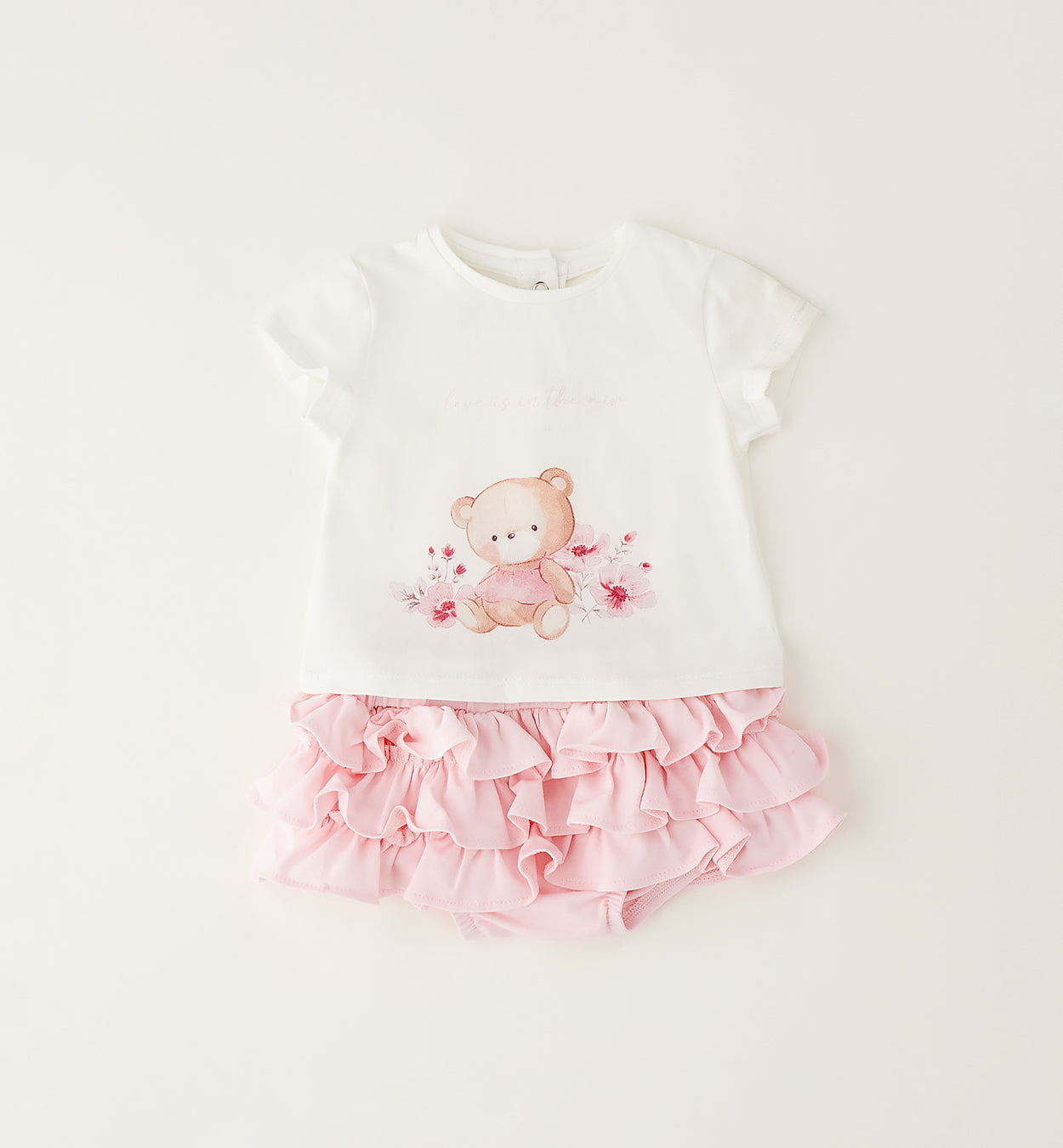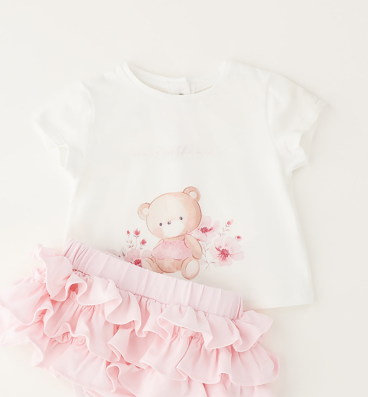 completo bambina panna e rosa con t-shirt stampata e coulotte con volant – completino due pezzi in morbido cotone, ideale per unire comfort e dolcezza nelle giornate estive. t-shirt panna a manica corta con delicata stampa centrale dell’orsetto tra fiori nei toni del rosa, dettaglio tenero e raffinato, con apertura posteriore a bottoncini per una vestizione pratica. coulotte coordinata rosa con balze a volant sovrapposte ed elastico in vita, effetto gonnellina romantica e femminile senza rinunciare alla comodità. perfetto per il tempo libero o per occasioni speciali, da abbinare a sandalini o ballerine per un look curato e irresistibile.