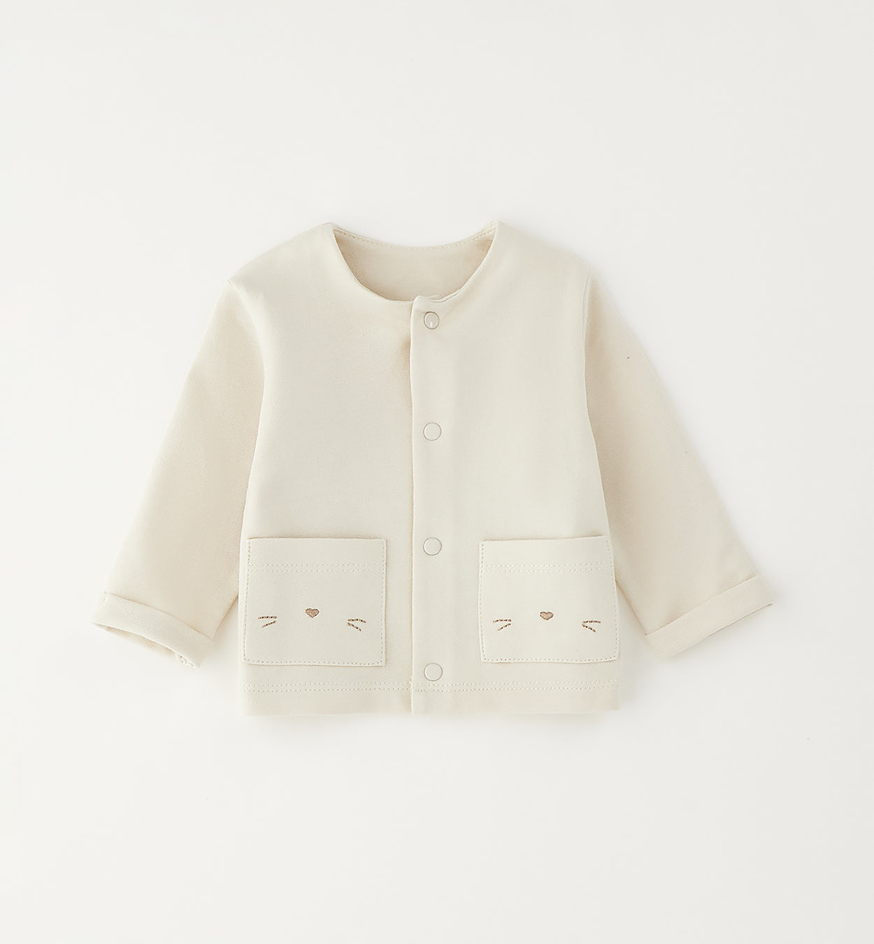completo bambino unisex panna tre pezzi con cardigan, body e pantalone a costine – completino coordinato in morbido cotone, pensato per accompagnare il neonato con comfort e delicatezza fin dai primi giorni. cardigan panna con apertura frontale a bottoncini e taschine applicate con ricamo a musetto, dettaglio dolce e raffinato. body a manica corta con micro stampa all-over tono su tono e pratica chiusura al cavallo per facilitare il cambio. pantalone coordinato a costine con vita elasticizzata e risvolto sul fondo, per una vestibilità comoda e naturale. ideale come completo nascita o per l’uso quotidiano, perfetto da indossare insieme o separatamente, per un look neutro, curato e senza tempo adatto sia a maschietto che femminuccia.