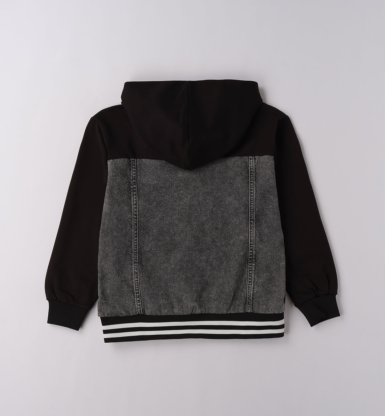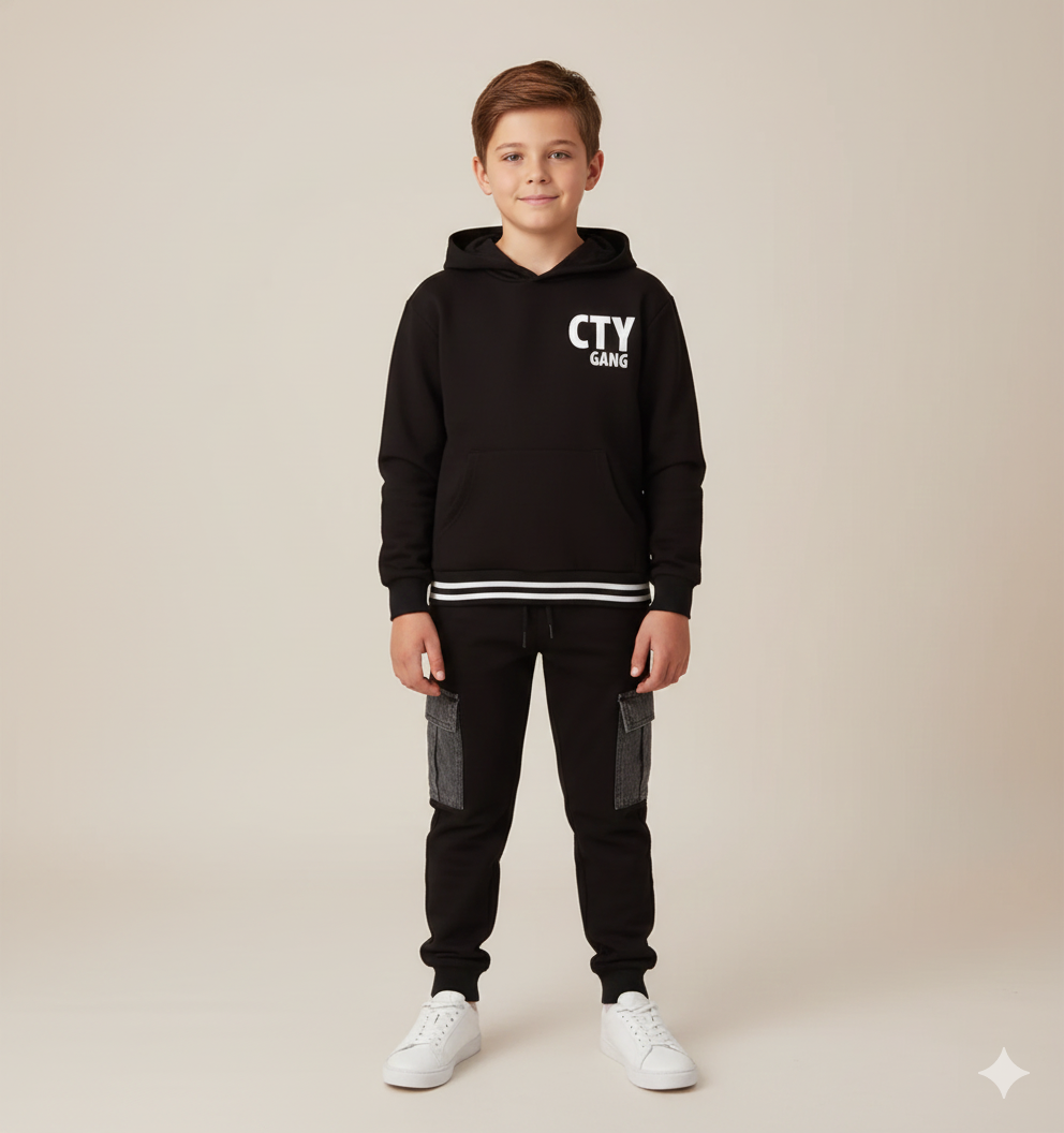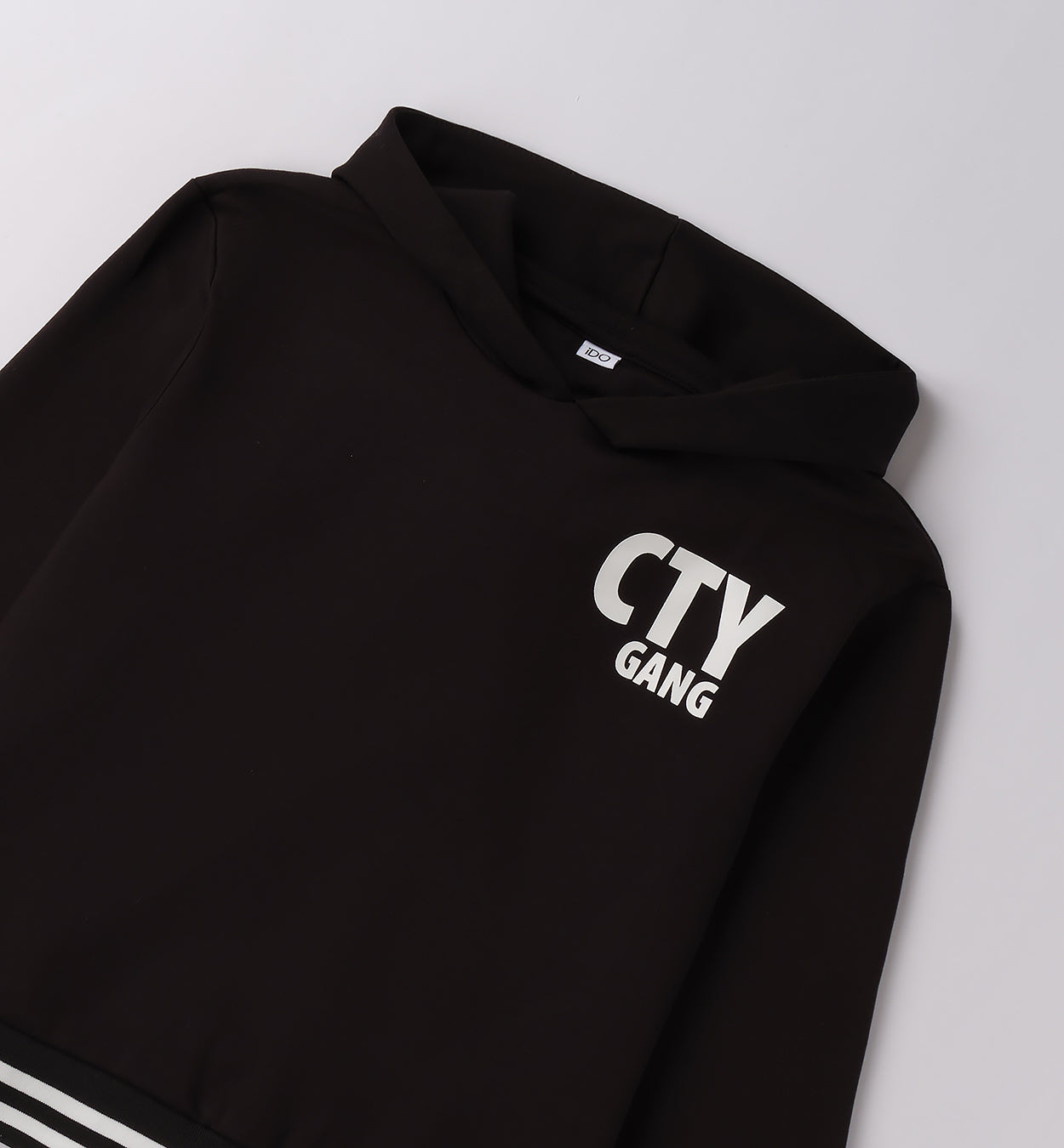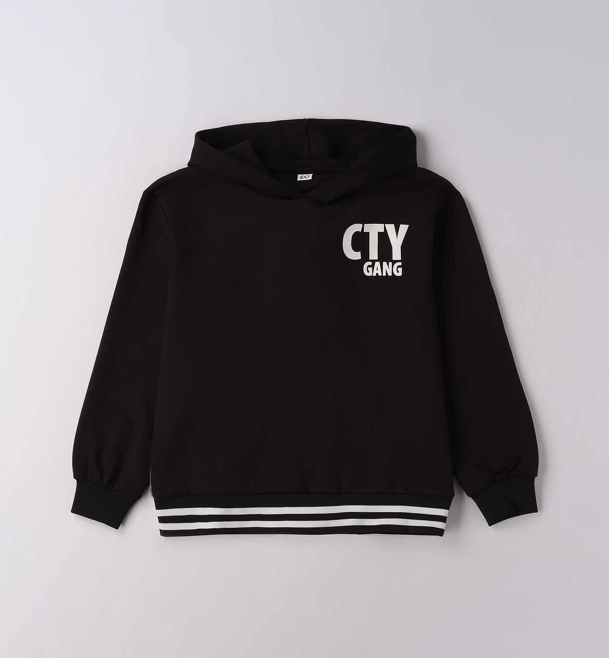felpa ragazzo nera con cappuccio e retro in jeans – felpa con cappuccio dal design urban, caratterizzata da stampa “cty gang” frontale e fondo a righe bianche e nere a contrasto. il retro presenta inserto in denim grigio effetto slavato che dona un tocco street originale. modello con maniche lunghe e polsini elasticizzati, ideale per outfit casual e moderni, perfetta da abbinare a jogger o jeans per look comodi e di tendenza.