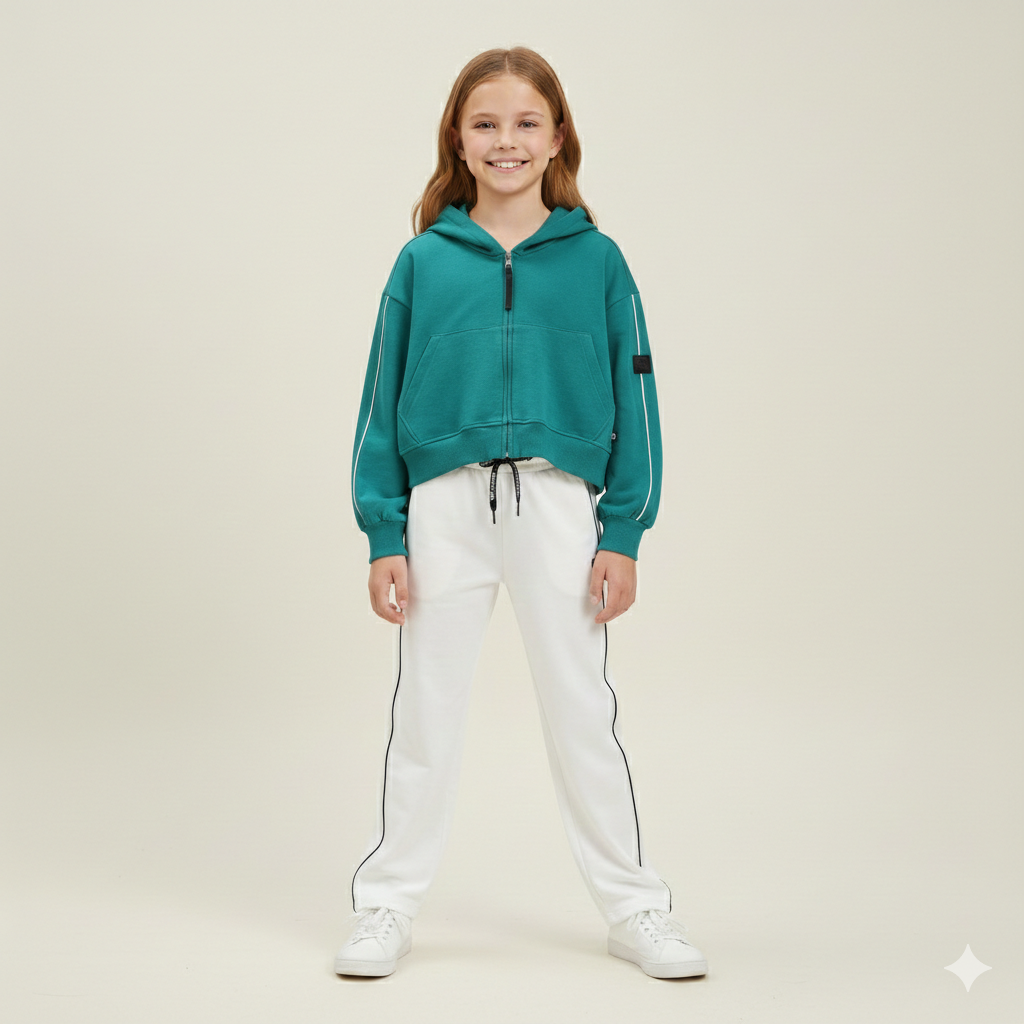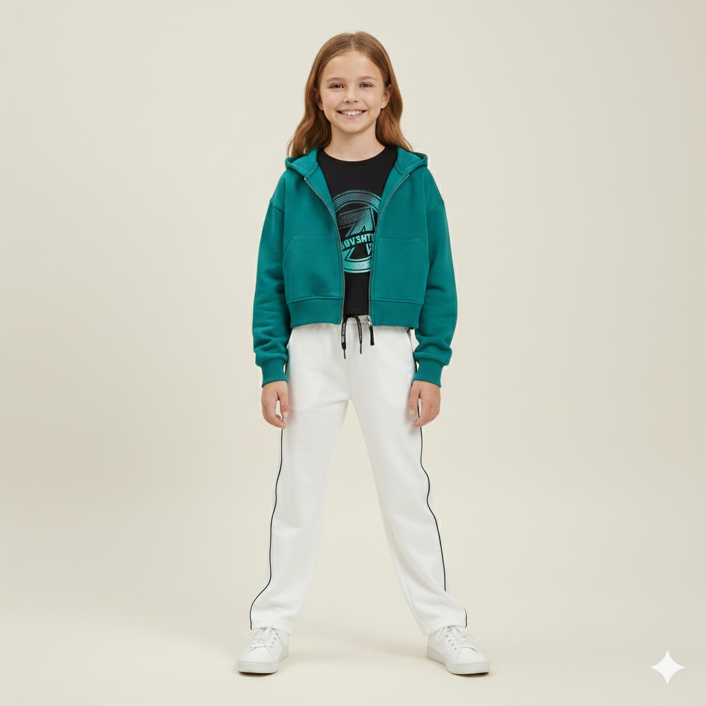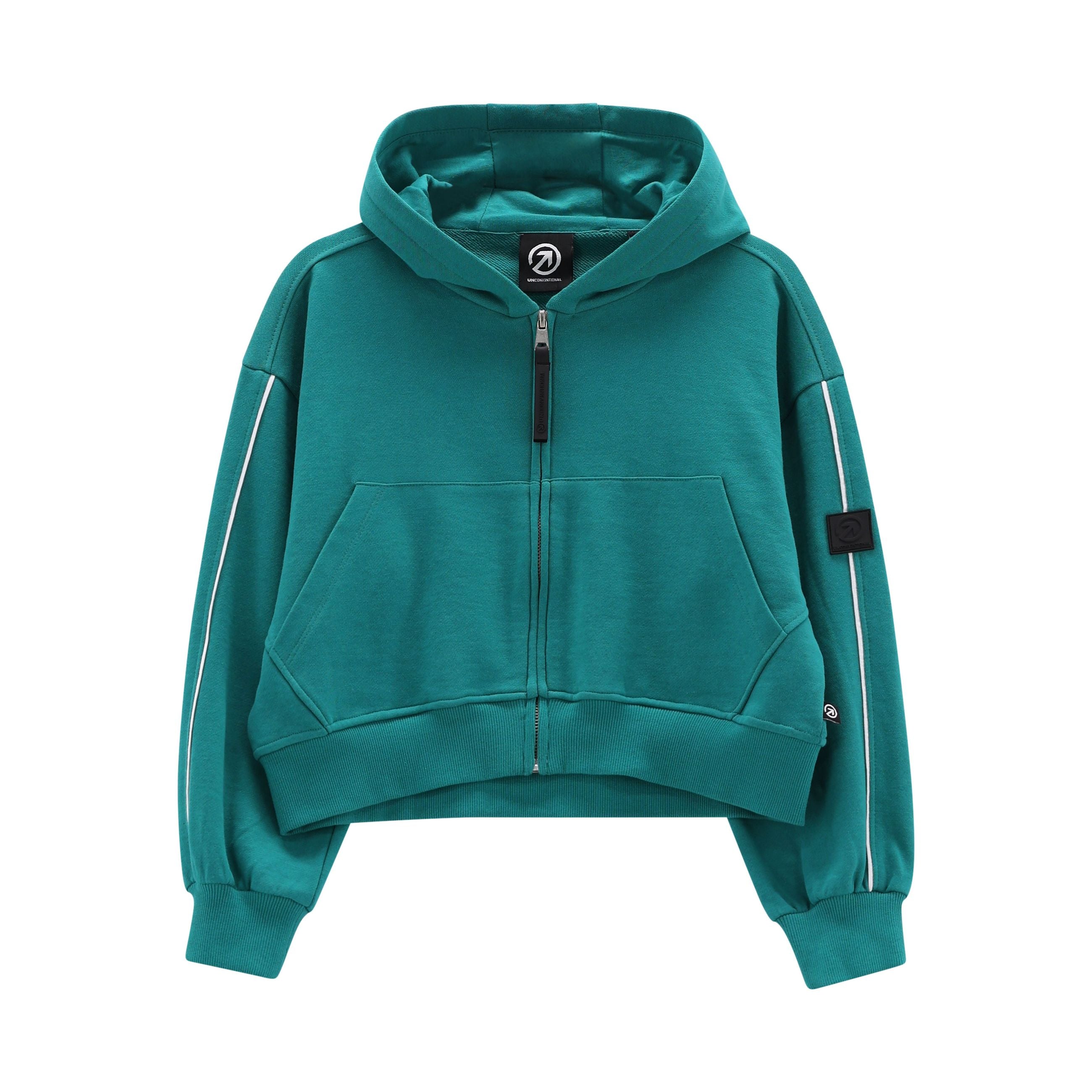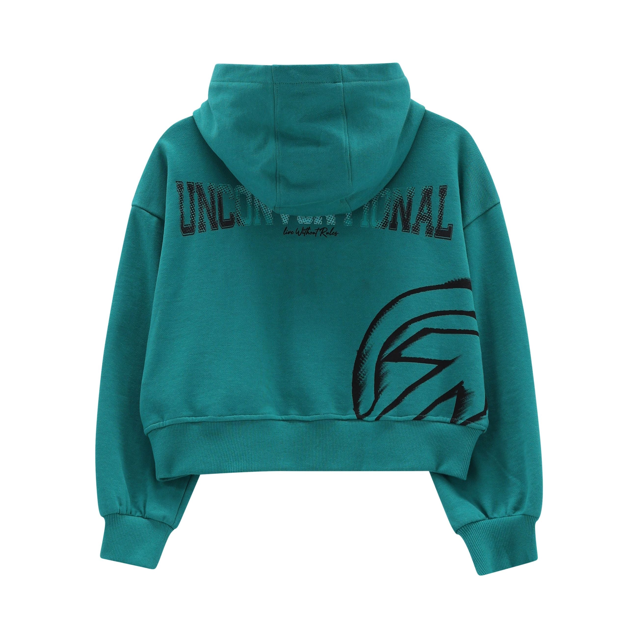 felpa con cappuccio ragazza verde petrolio con zip e stampa – felpa dal carattere urban e contemporaneo, realizzata in morbido cotone per offrire comfort e vestibilità avvolgente. il modello con cappuccio e zip frontale presenta tasca a marsupio e dettagli a contrasto lungo le maniche che valorizzano il design sportivo. sul retro spicca la stampa maxi con scritta “unconv3ntional – live without rules” e grafica decisa, pensata per dare personalità al capo. vestibilità leggermente cropped, ideale per outfit moderni e dinamici. perfetta da abbinare a jogger, leggings o pantaloni cargo per look di tendenza, adatti al tempo libero e alla scuola.