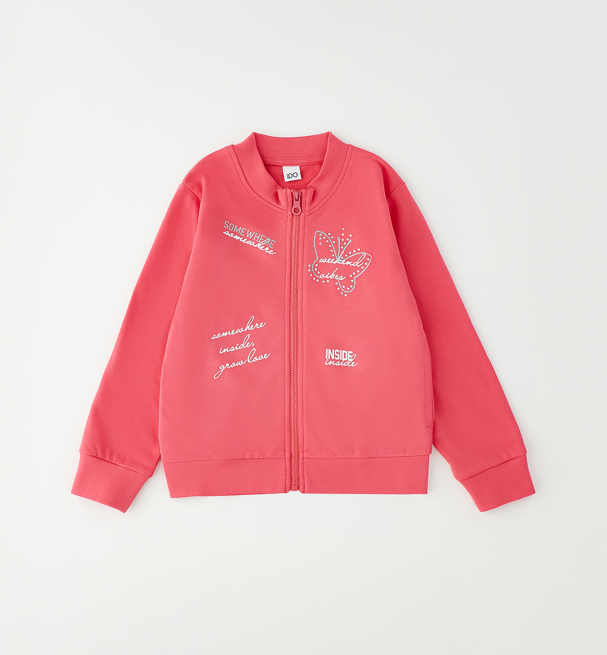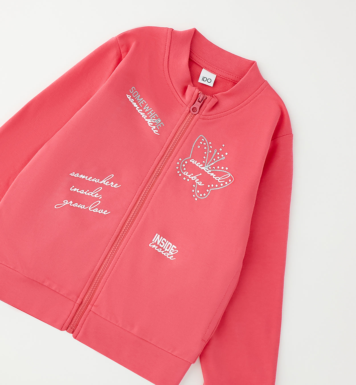 felpa con zip bambina corallo con stampa farfalla – felpa in morbido cotone dalla vestibilità comoda, caratterizzata da chiusura frontale con zip e collo bomber che dona un tocco sportivo e moderno. impreziosita da grafiche stampate e scritte lettering sul davanti con dettaglio farfalla decorata da piccoli punti luce che aggiungono brillantezza al capo. modello con polsini e fondo elasticizzati, ideale per completare outfit casual e dinamici, perfetta da abbinare a leggings, jeans o pantaloni sportivi per il tempo libero e la scuola.