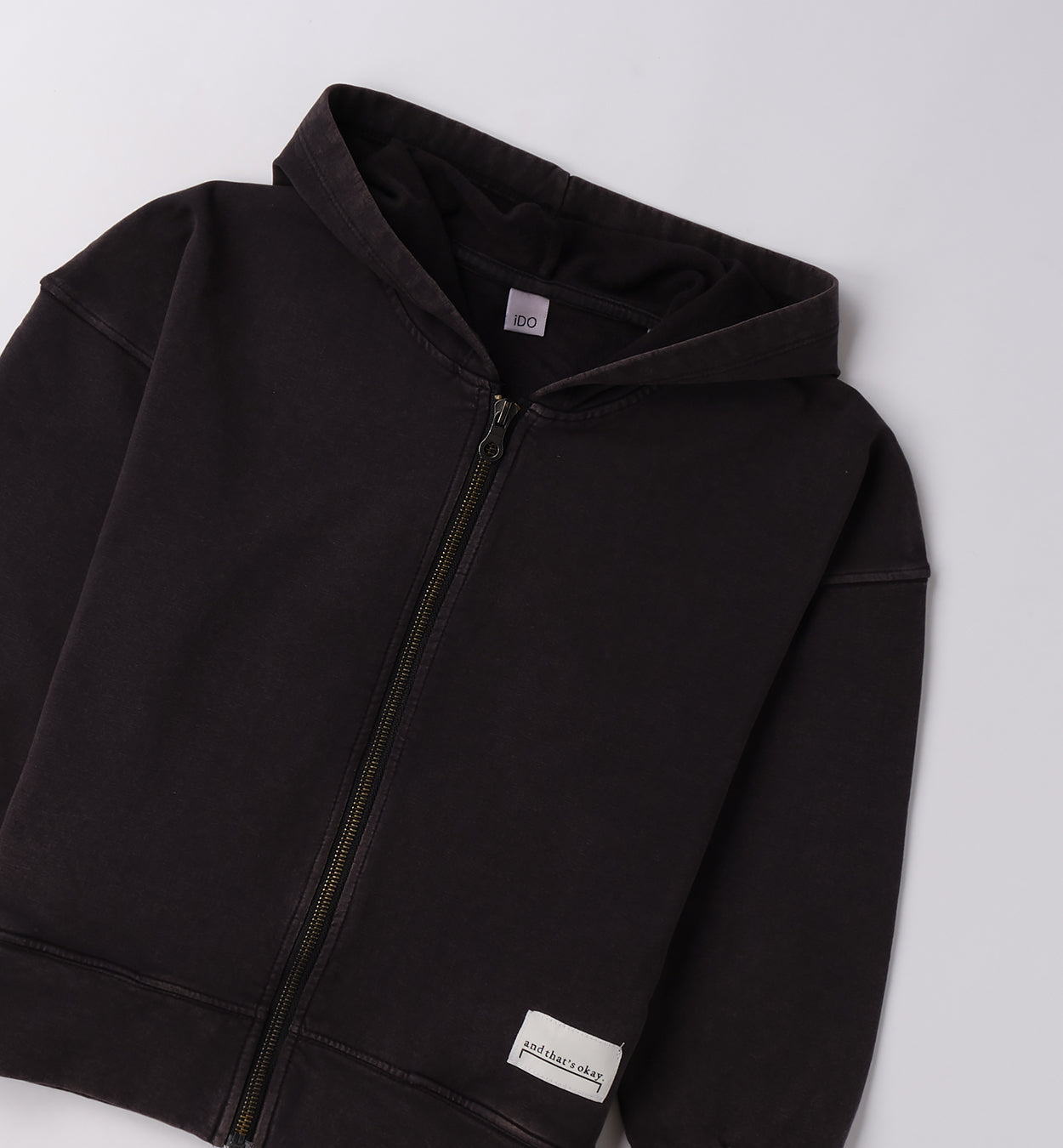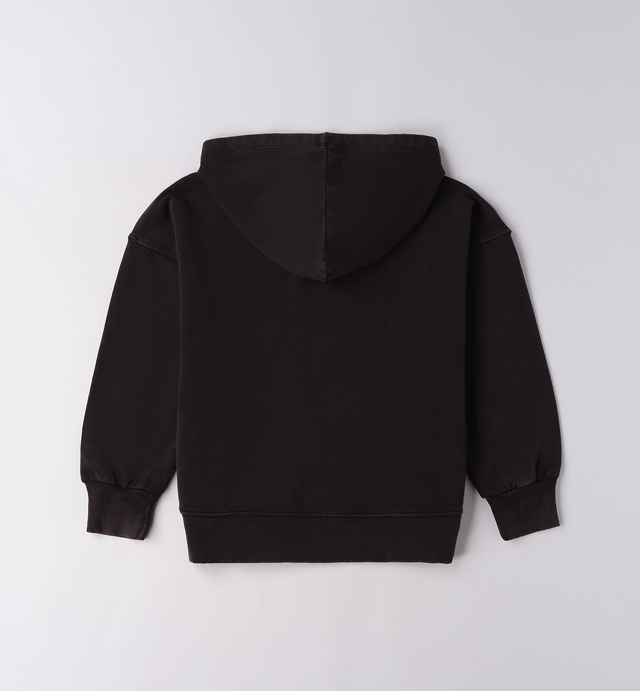 felpa con zip e cappuccio ragazza nero con patch – modello in felpa garzata dal look urbano con chiusura a zip e cappuccio comodo, rifinito con polsini e fondo a costine elasticizzate. design essenziale arricchito da etichetta applicata frontale tono su tono per un tocco moderno. pratica e versatile, perfetta per completare outfit sportivi o casual insieme a t-shirt e jogger per tutti i giorni.