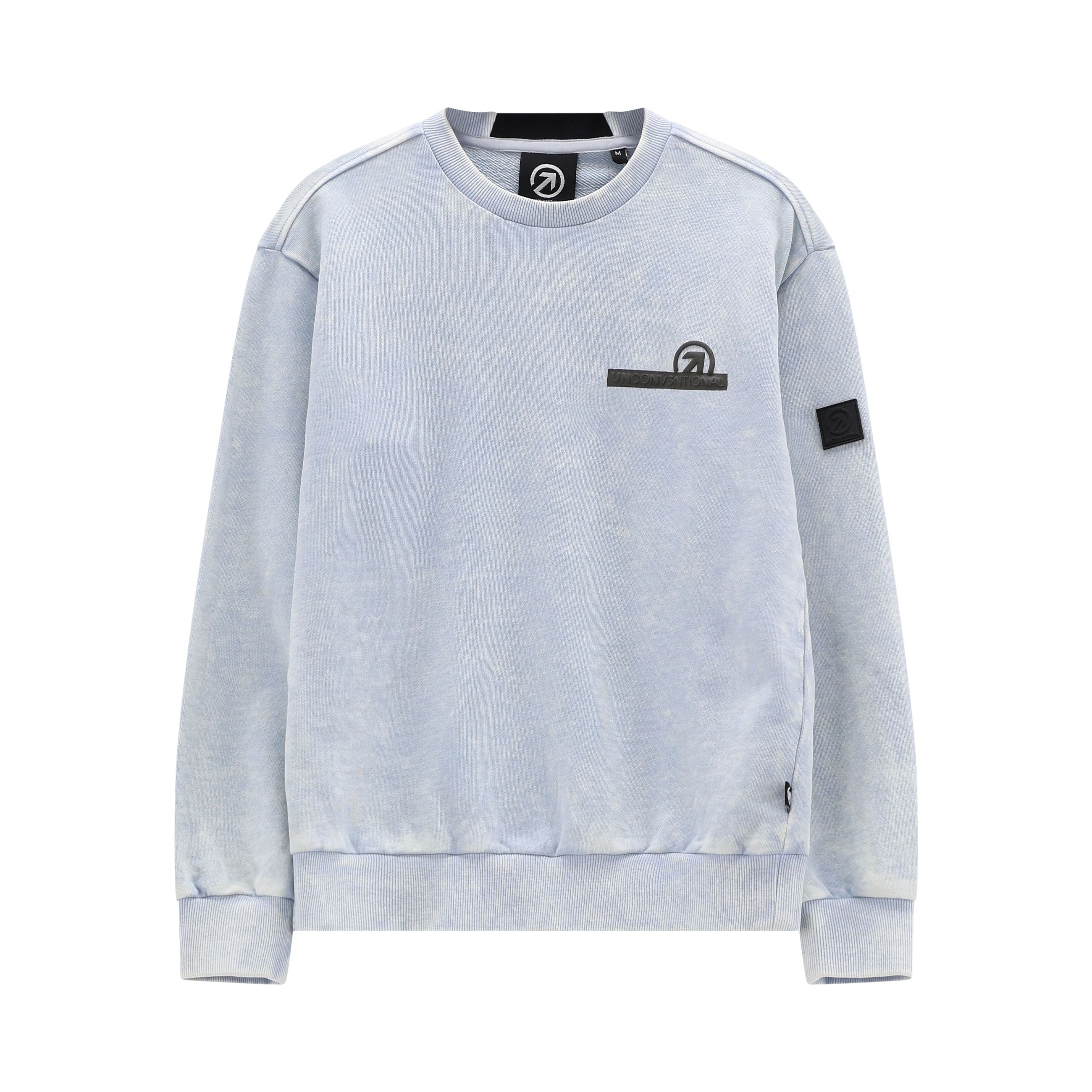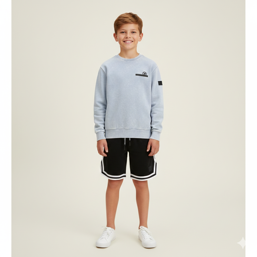felpa girocollo ragazzo azzurro effetto lavato con logo – felpa in morbido cotone dal look urban e contemporaneo, caratterizzata da un particolare effetto lavato che rende ogni capo unico e di tendenza. il modello presenta girocollo classico, polsini e fondo elasticizzati per una vestibilità comoda e ben strutturata. sul davanti è arricchita da logo applicato tono su tono, mentre sulla manica è presente un dettaglio patch che richiama uno stile street deciso ma pulito. ideale da abbinare a jogger, jeans o bermuda coordinati per creare outfit casual perfetti per scuola e tempo libero.