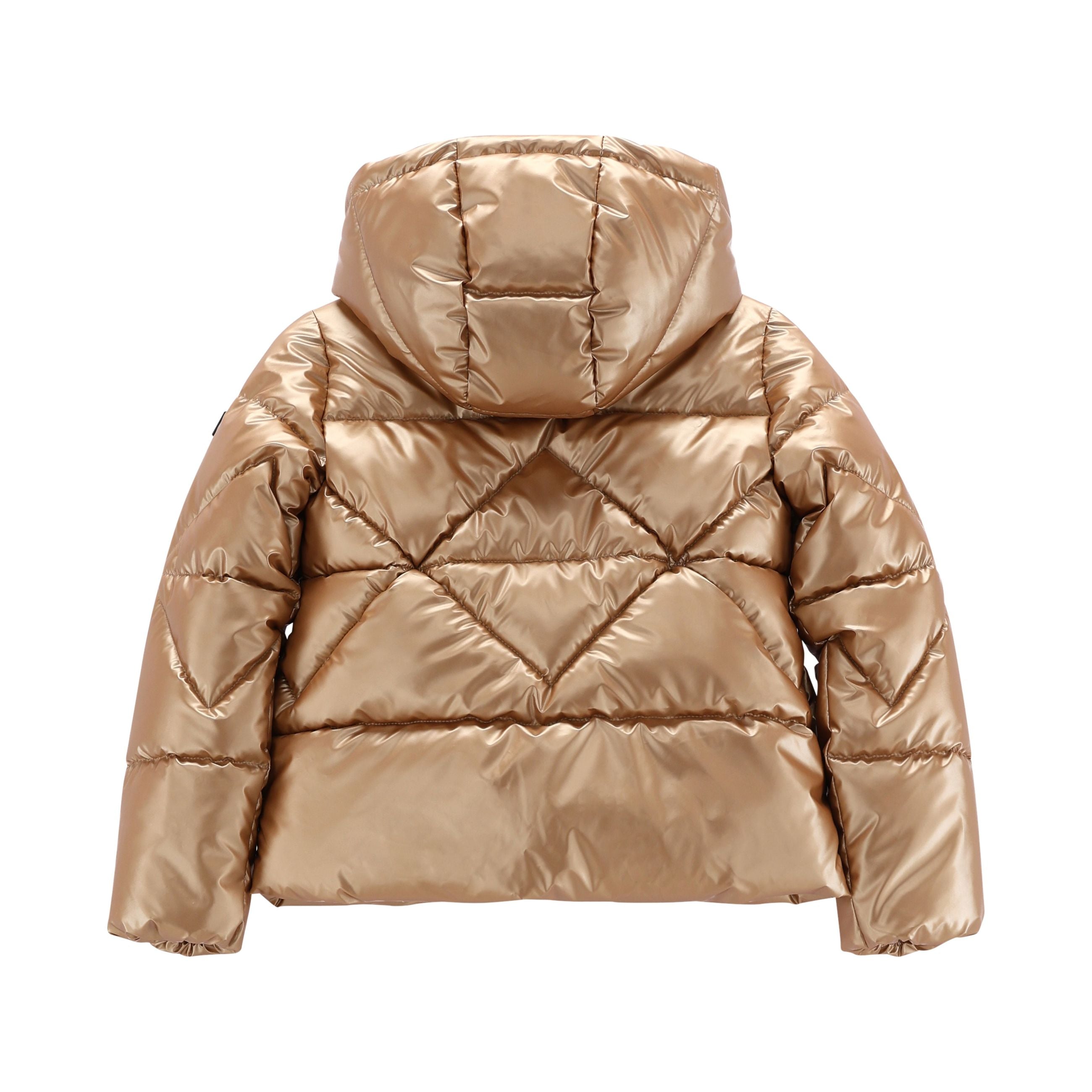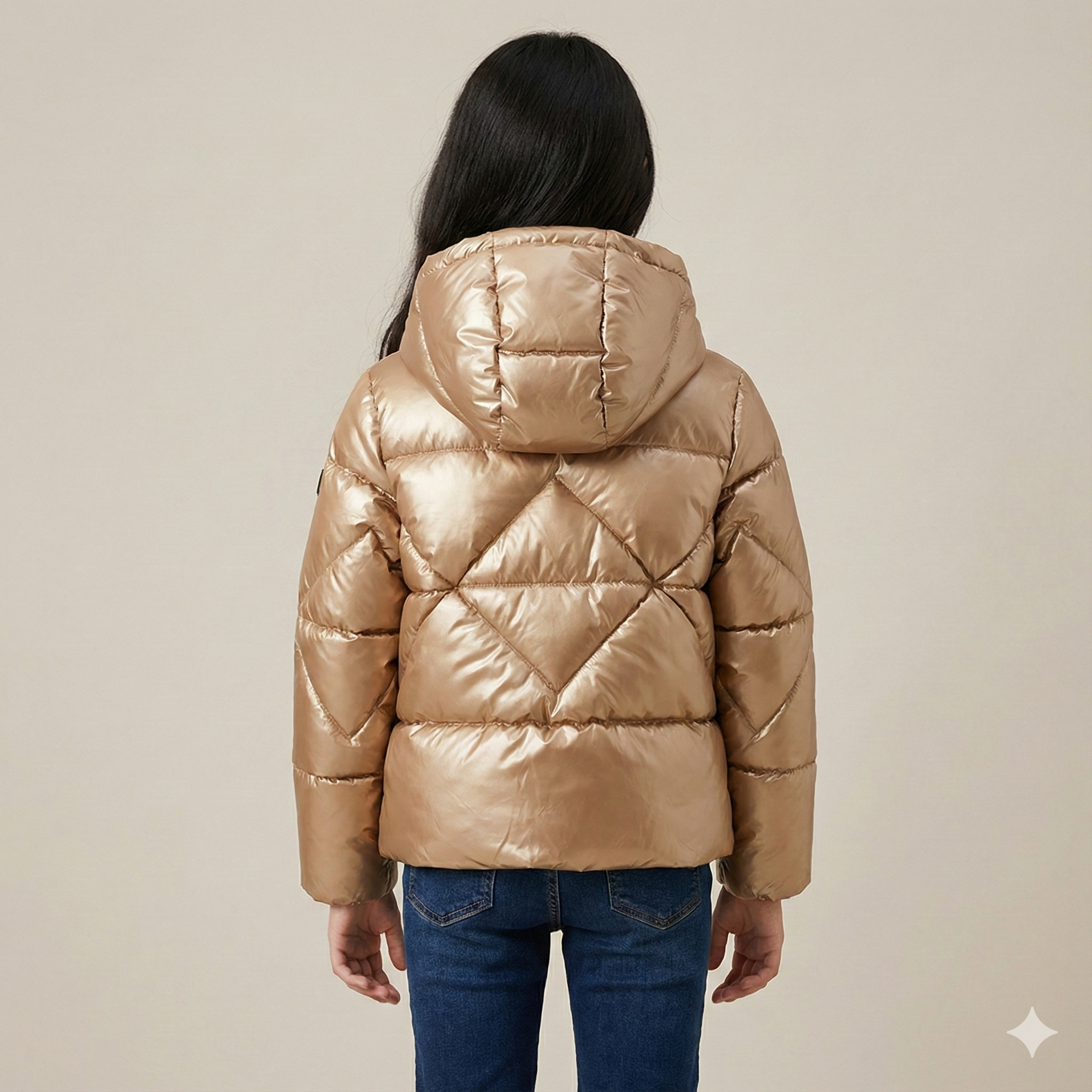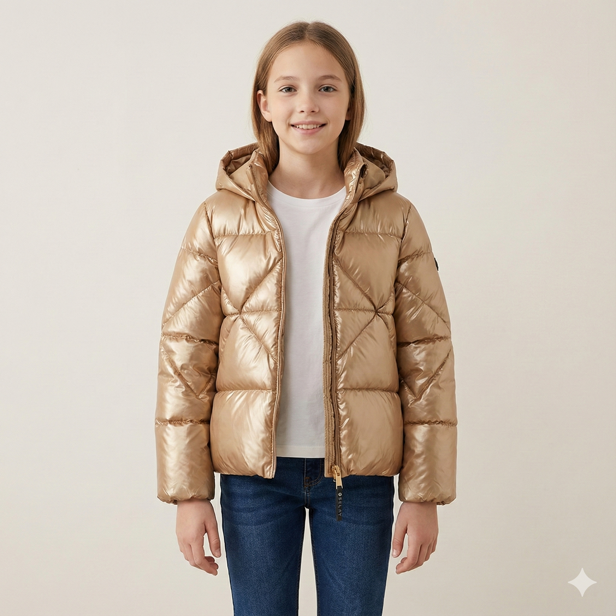 giubbotto imbottito ragazza oro con cappuccio – giubbotto in tessuto tecnico dal finitura lucida con trapuntatura a motivo geometrico e imbottitura calda, ideale per l'inverno. modello con cappuccio fisso e zip frontale, elastico ai polsi e taglio leggermente svasato sul fondo per maggiore comfort. pratico e versatile, dona un tocco elegante e moderno agli outfit quotidiani, perfetto da abbinare a jeans o pantaloni sportivi per un look casual chic.