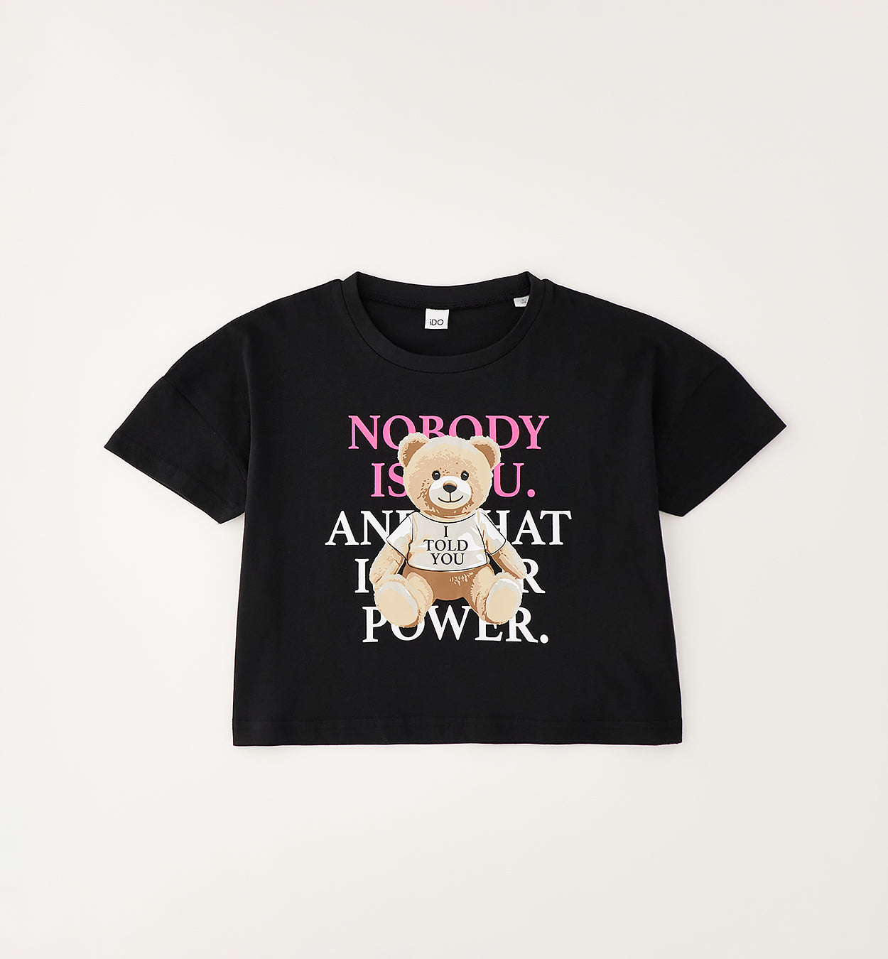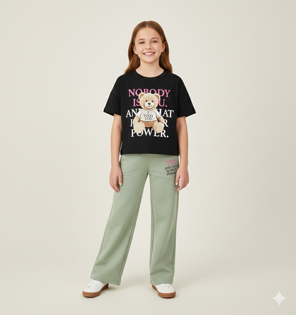 maglietta manica corta ragazza nera con stampa teddy e scritte – t-shirt in morbido cotone dalla vestibilità cropped, caratterizzata da una grafica frontale d’impatto con orsetto centrale e scritte a contrasto bianco e rosa che donano un tocco grintoso e attuale. modello dal taglio moderno, ideale per ragazze che amano uno stile trendy e deciso, comoda da indossare ogni giorno e facile da abbinare a jeans a vita alta, pantaloni cargo o gonne per creare outfit casual dal carattere contemporaneo.