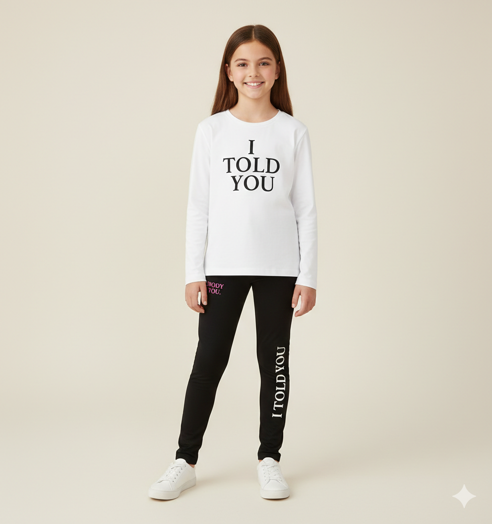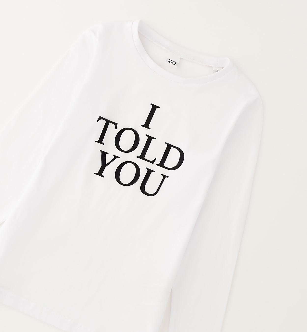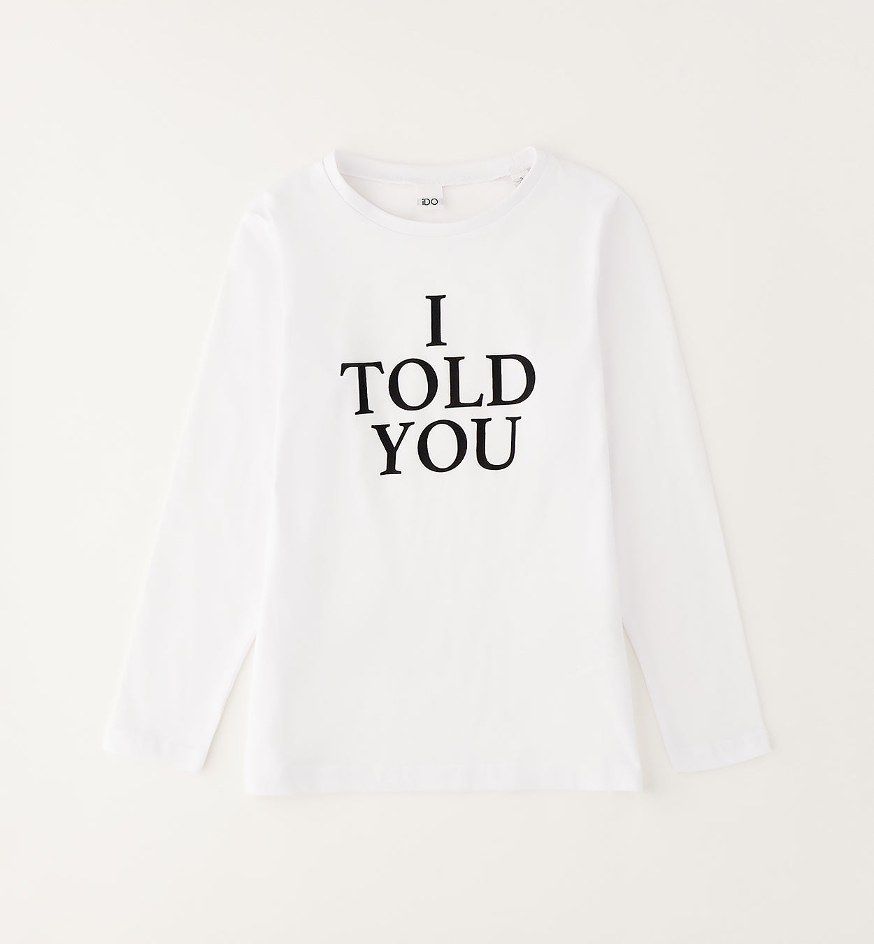 maglietta manica lunga ragazza bianca con scritta – t-shirt a manica lunga in morbido cotone elasticizzato dal colore bianco pulito, dal design essenziale ma di carattere. il modello presenta una stampa frontale con scritta “I TOLD YOU” in contrasto nero, dallo stile minimal e moderno, perfetta per look casual e contemporanei. vestibilità comoda con girocollo classico, facile da abbinare a jeans, pantaloni cargo o gonne per outfit quotidiani semplici ma decisi. ideale per ragazze che amano uno stile pulito, urbano e sempre attuale.