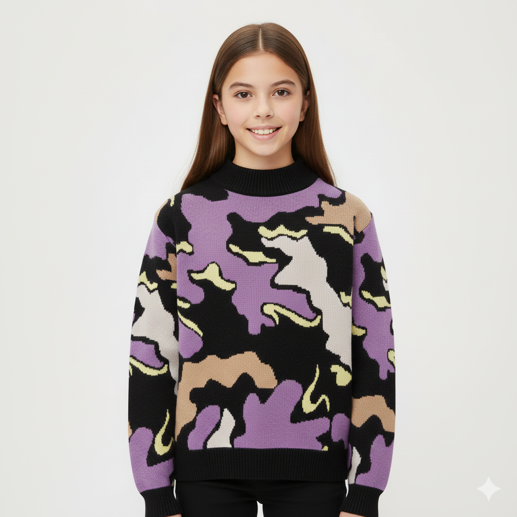 maglione ragazza fantasia mimetica viola – maglione in caldo cotone con stampa mimetica astratta nei toni del viola, nero, beige e verde acido, per un look moderno e grintoso. modello con collo, polsini e fondo lavorati a costine per una vestibilità confortevole, ideale per ravvivare gli outfit casual quotidiani. perfetto da abbinare a jeans o pantaloni jogger per uno stile urbano e di tendenza.
