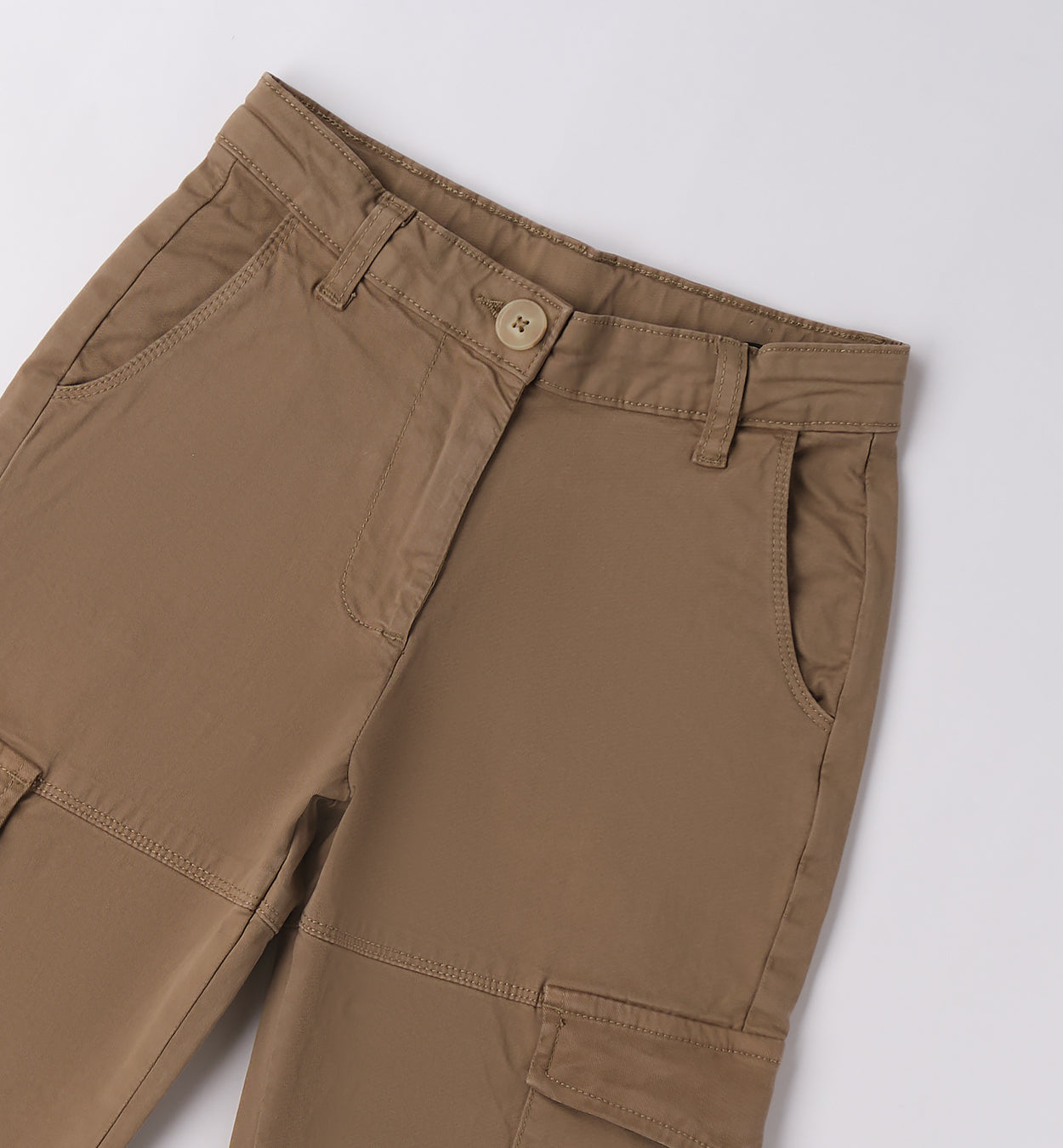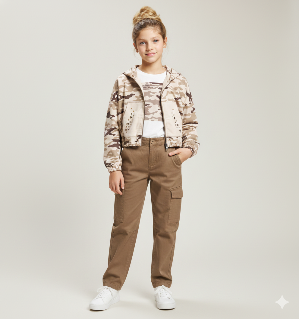 pantaloni cargo ragazza marroni – modello in cotone resistente con tasche laterali applicate, ideale per un look pratico e di tendenza. vita con passanti e chiusura con bottone e zip, retro con tasche a filetto con pattina. vestibilità comoda pensata per accompagnare i movimenti quotidiani, perfetti da abbinare a felpe, t-shirt o giubbotti per creare outfit casual e dinamici.