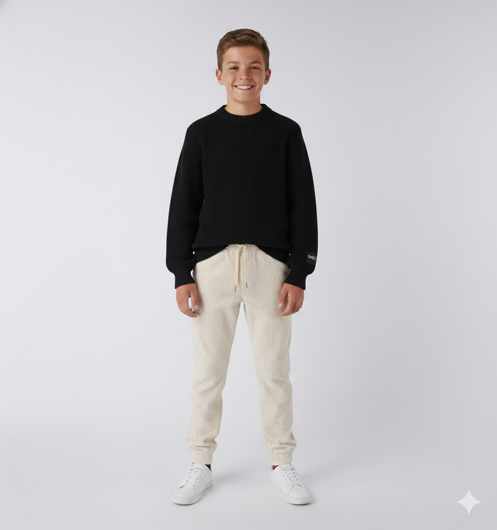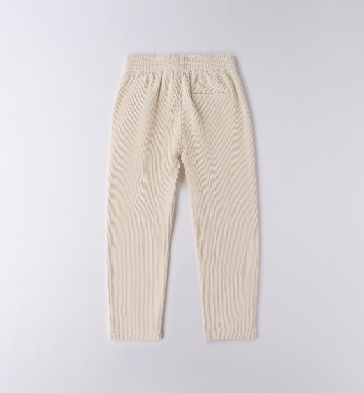 pantaloni in velluto a coste bambino panna – modello morbido e confortevole con vita elasticizzata e coulisse regolabile, realizzato in velluto a coste sottili che dona un tocco raffinato anche ai look quotidiani. tasche laterali e taschino sul retro completano il design pratico e moderno. perfetti da abbinare a maglioncini o felpe per un outfit casual chic, ideale per la stagione autunnale e invernale.