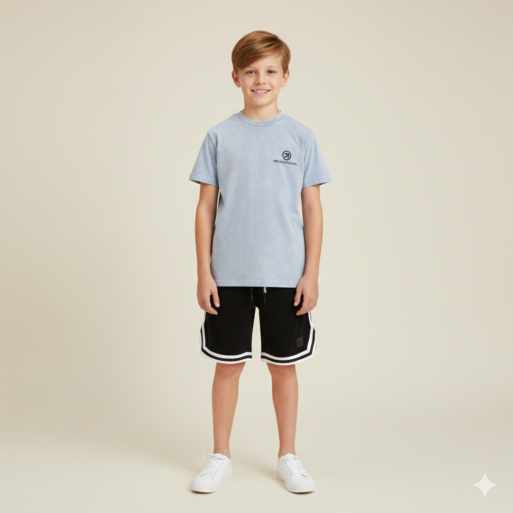 t-shirt ragazzo azzurro polvere effetto lavato con logo – t-shirt a manica corta realizzata in morbido cotone, caratterizzata da una finitura effetto lavato che dona al capo un aspetto leggermente vissuto e contemporaneo. il modello presenta girocollo classico e vestibilità comoda, ideale per garantire libertà di movimento e comfort durante tutta la giornata. sul petto è presente una stampa logo “unconv3ntional” discreta e minimal, che valorizza il design con un tocco urban pulito. linea essenziale sul retro per una maggiore versatilità. perfetta da abbinare a bermuda, shorts o pantaloni jogger per creare outfit casual e di tendenza, adatti a scuola, tempo libero e giornate estive.