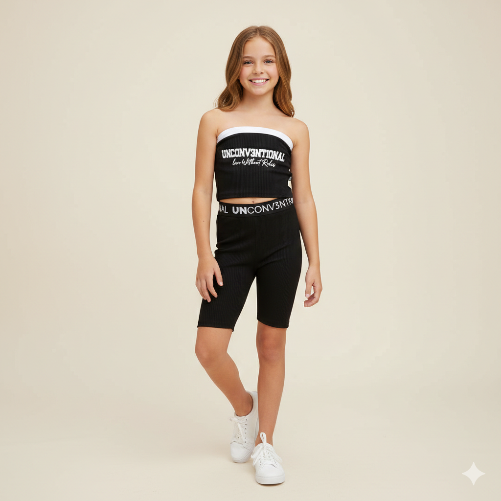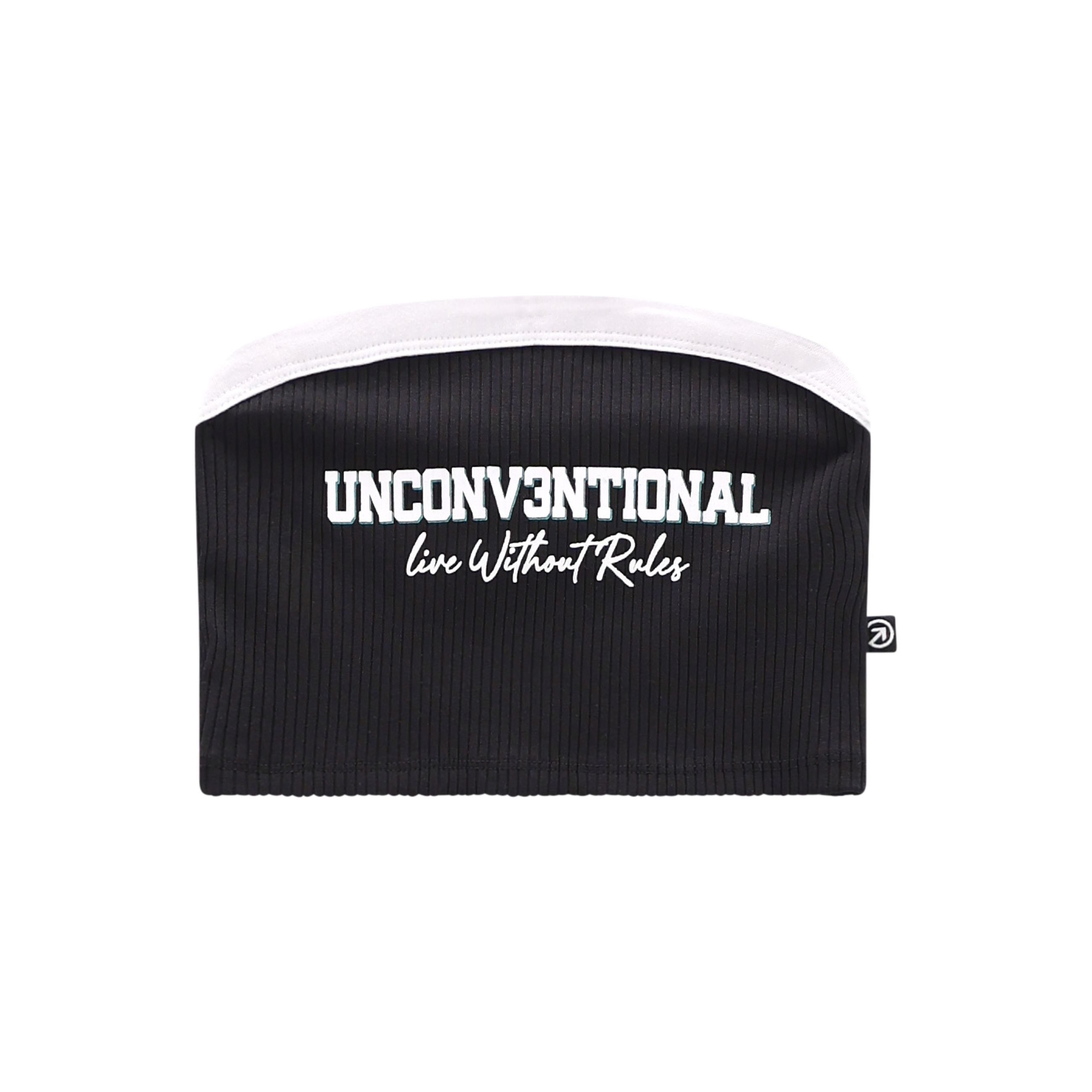 top a fascia ragazza nero a costine con scritta – top dallo stile urban e contemporaneo, realizzato in morbido tessuto a costine elasticizzato per garantire comfort e vestibilità aderente. il modello a fascia è rifinito con bordo superiore a contrasto e presenta sul davanti la scritta stampata “unconv3ntional – live without rules”, che dona carattere e personalità al capo. design essenziale sul retro, pensato per essere versatile e facile da abbinare. perfetto con pantaloni cargo, jogger o bermuda a vita alta per creare outfit moderni e di tendenza, ideali per tempo libero e look estivi decisi.