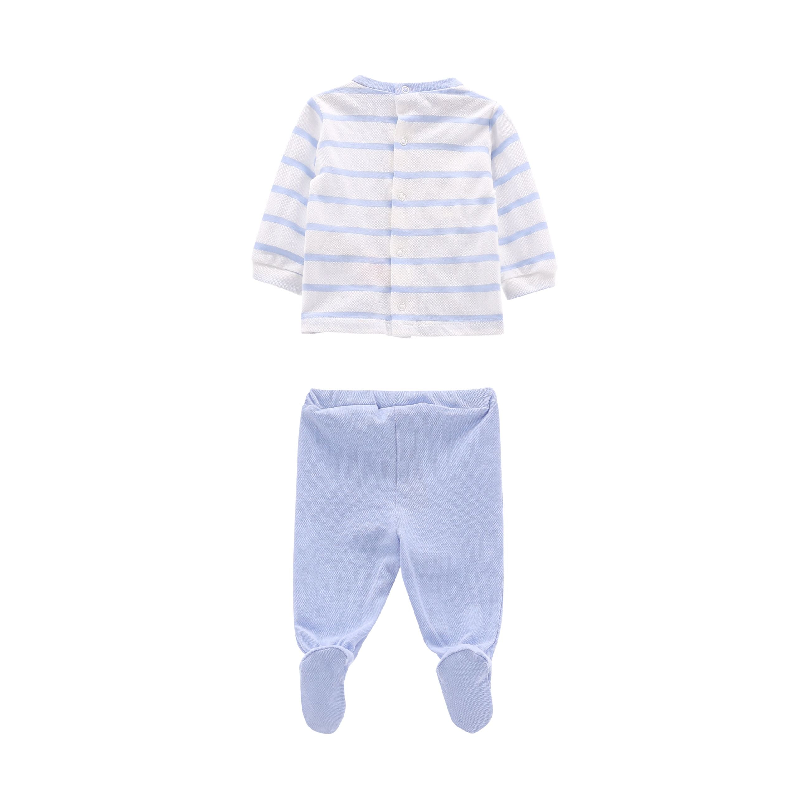 completo neonato due pezzi azzurro cielo con maglia rigata e pantalone con piedini – set coordinato pensato per i primi mesi, composto da maglia a manica lunga in morbido jersey di cotone con delicate righe orizzontali e applicazioni decorative, abbinata a pantalone con piedini in tessuto piqué dall’effetto raffinato. modello confortevole e pratico, con apertura posteriore per facilitare il cambio e vita elasticizzata per una vestibilità delicata, ideale per un look curato ma comodo da indossare ogni giorno. perfetto da usare come completo nascita o per le prime uscite, da abbinare a cardigan o copertina nelle stagioni più fresche.