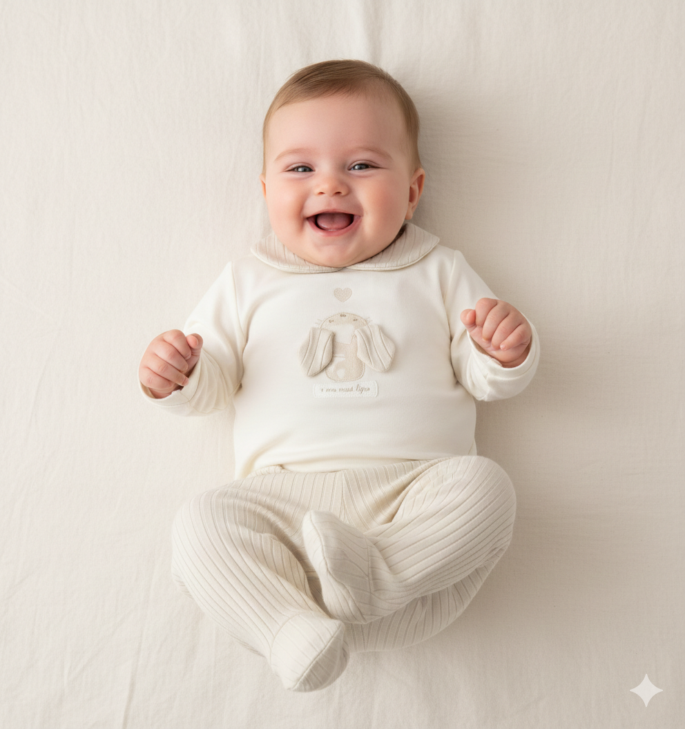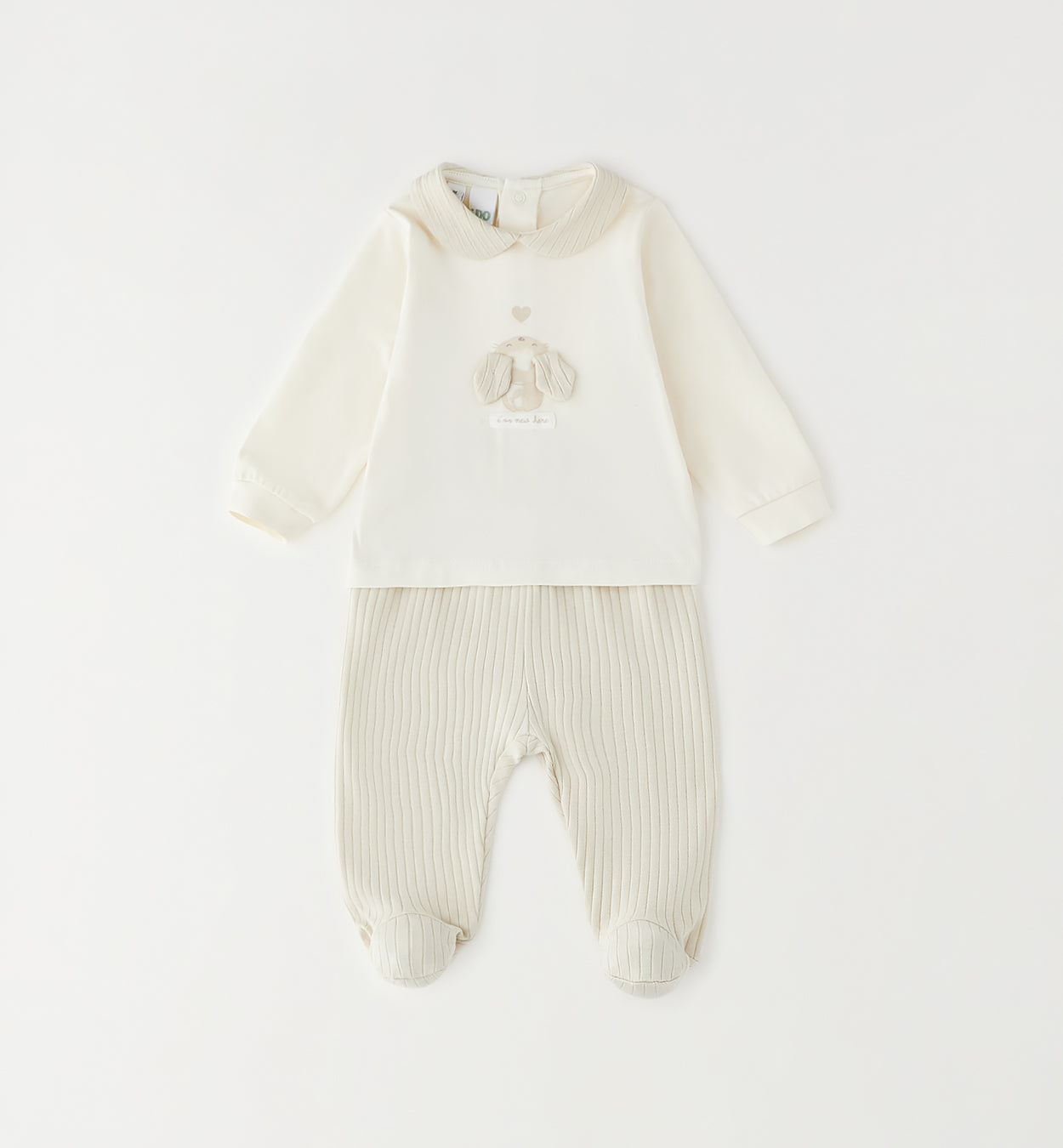 tutina neonato unisex panna due pezzi con colletto e applicazione – tutina 2 pezzi in morbido cotone, studiata per garantire comfort e delicatezza sulla pelle del neonato fin dai primi giorni. maglia a manica lunga con raffinato colletto coordinato, apertura posteriore a bottoncini e applicazione centrale con tenero animaletto e cuoricino, impreziosita da orecchiette in rilievo per un tocco dolce. pantalone coordinato a costine con piedini e vita elasticizzata, pensato per offrire una vestibilità comoda e avvolgente. ideale come tutina nascita o per le giornate più fresche, perfetta da indossare anche sotto un sacco nanna per un look pulito, elegante e senza tempo.