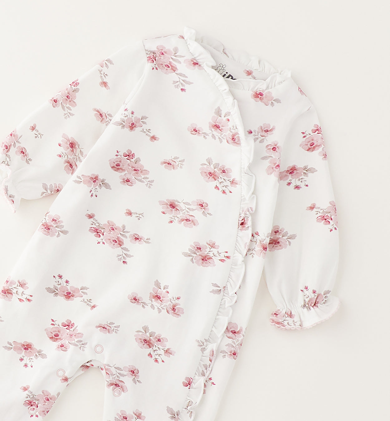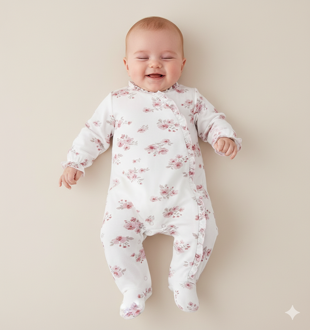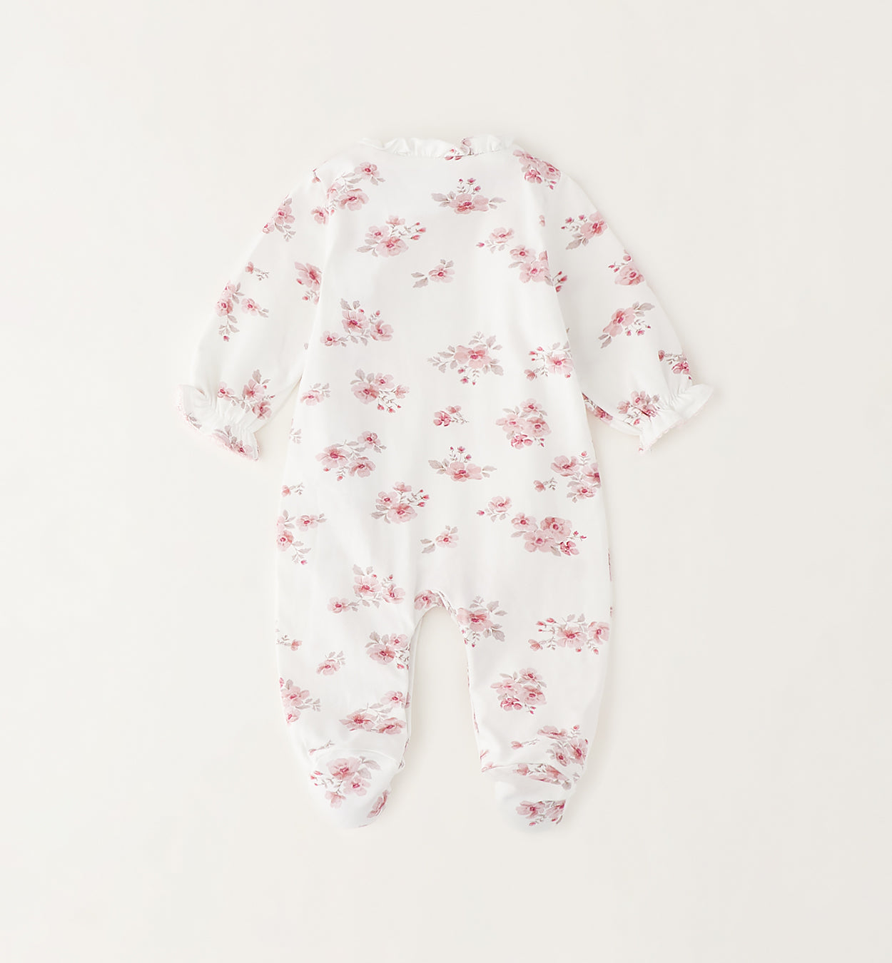 tutina neonata panna con stampa floreale e volant – tutina intera in morbido cotone elasticizzato, pensata per avvolgere la neonata con comfort e delicatezza fin dai primi giorni. modello a manica lunga con romantica stampa floreale all-over nei toni del rosa cipria, arricchito da volant decorativo lungo la chiusura frontale che dona un tocco raffinato ed elegante. apertura pratica con bottoncini per facilitare il cambio e piedini integrati per tenere i piedini sempre al caldo. ideale come tutina nascita o per le giornate più fresche, perfetta da abbinare a una copertina o a un cappellino coordinato per un look dolce, curato e senza tempo.