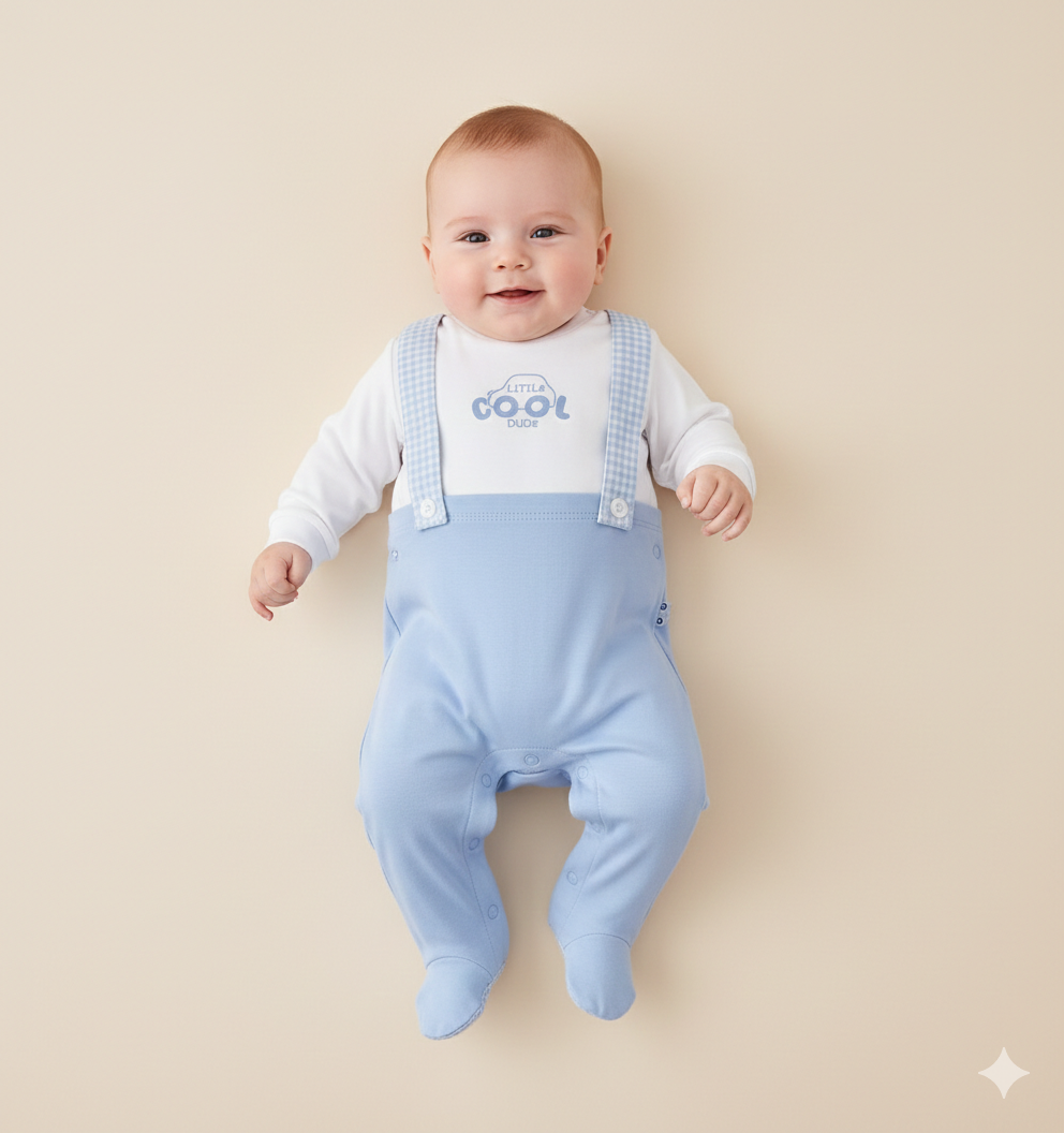 tutina neonato azzurra con effetto salopette e stampa – tutina intera in morbido cotone, pensata per garantire comfort e praticità fin dai primi giorni. modello con manica lunga e parte superiore bianca effetto t-shirt, arricchita da stampa “little cool dude”, abbinata a salopette azzurra con spalline effetto vichy applicate per uno stile dolce e curato. apertura posteriore e al cavallo con bottoncini per facilitare il cambio, piedini integrati per tenere il neonato sempre al caldo. ideale come tutina quotidiana o per un’occasione speciale, perfetta da abbinare a cappellino e copertina coordinati per un look tenero e senza tempo.