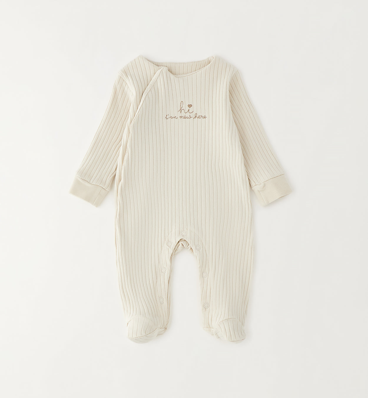 tutina intera neonato unisex panna a costine con ricamo – tutina in morbido cotone a costine dal delicato colore panna, pensata per accompagnare il neonato con comfort e dolcezza nei primi mesi. modello con apertura incrociata sul davanti e pratici bottoncini sul fondo per facilitare il cambio, impreziosita da un ricamo centrale “hi i’m new here” tono su tono che aggiunge un tocco tenero e raffinato. polsini e piedini integrati garantiscono una vestibilità avvolgente e protettiva, ideale da indossare da sola o come primo strato sotto una copertina nelle giornate più fresche. perfetta per corredino, nascita o come idea regalo unisex.