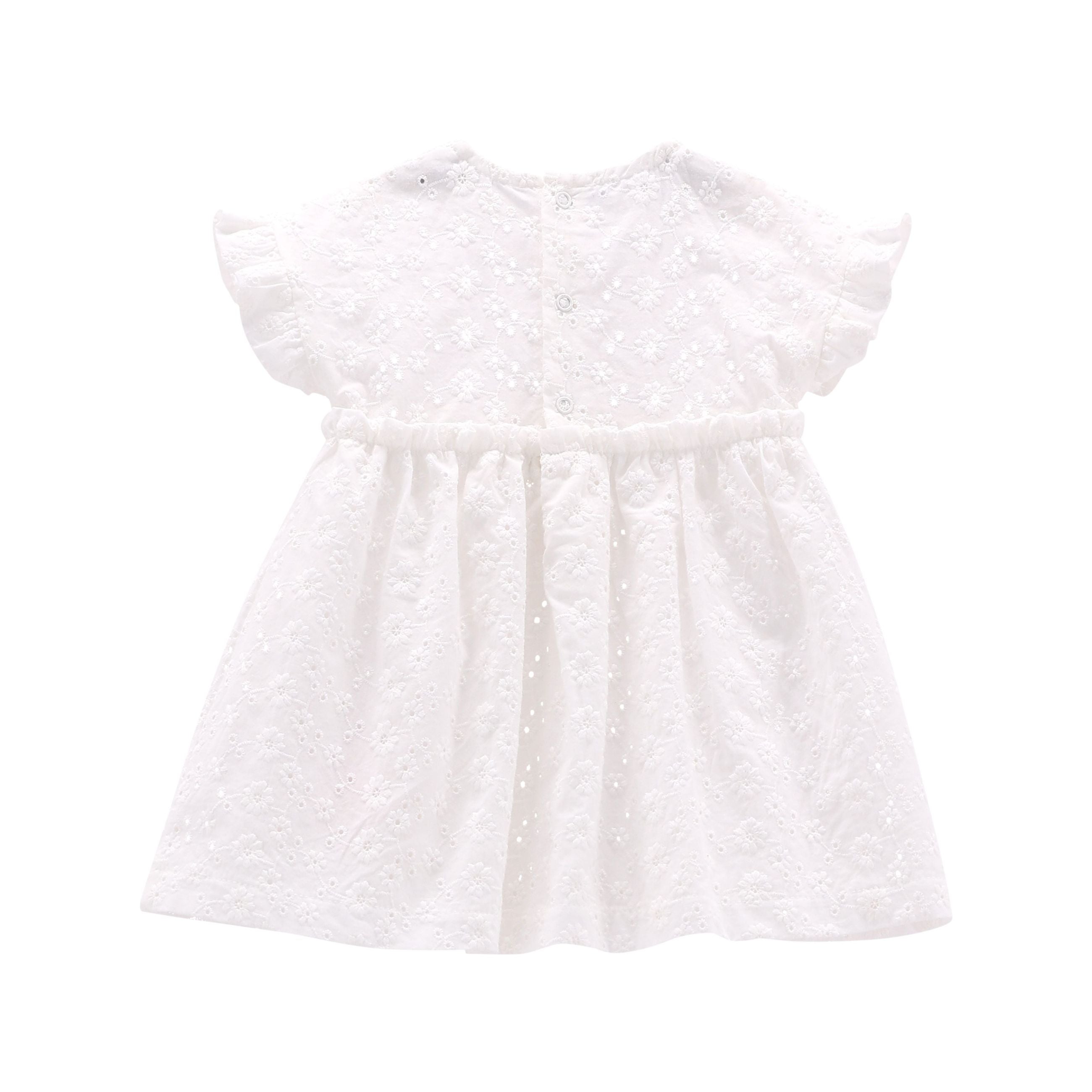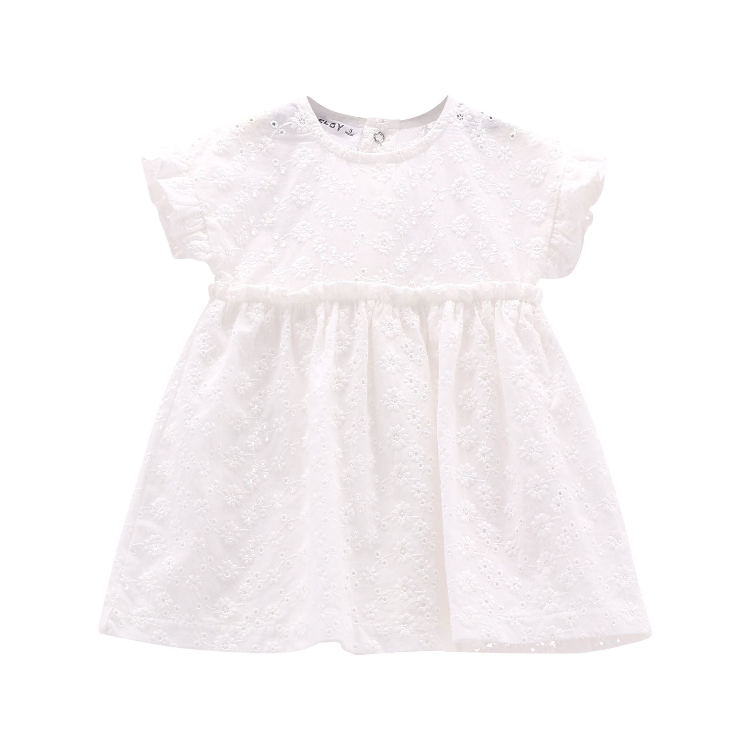 – abito per neonata in leggero cotone sangallo, caratterizzato da una delicata lavorazione ricamata all over che dona un effetto romantico ed elegante. modello con maniche corte a volant, vita leggermente arricciata e chiusura con bottoncini sul retro per una vestibilità pratica e confortevole. ideale per cerimonie, occasioni speciali o per un look estivo raffinato, perfetto da abbinare a scarpine eleganti o sandaletti per un outfit dolce e senza tempo.